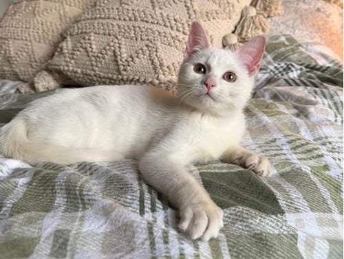 Meet Ralphie – the silent, snowy wonder who’s got more personality than a room full of chatty cats! This 4.5-month-old white male kitten may be deaf, but trust us—he never misses a beat when it comes to showering you with love, playful pounces, and heart-melting purrs.